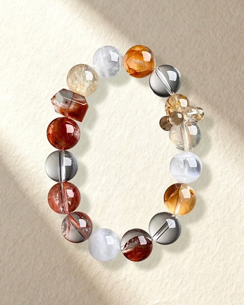 Natural Clear Quartz, Red Hematoid Quartz, Golden Rutilated Quartz, White Phantom Quartz, Yellow Hematoid Quartz, with a Golden Rutilated accent bead.