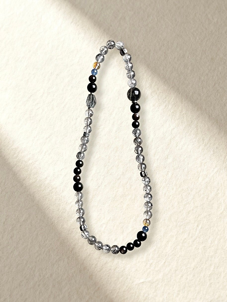 Black Rutilated Quartz, Black Strawberry Quartz, Golden Topaz, Silver Obsidian.