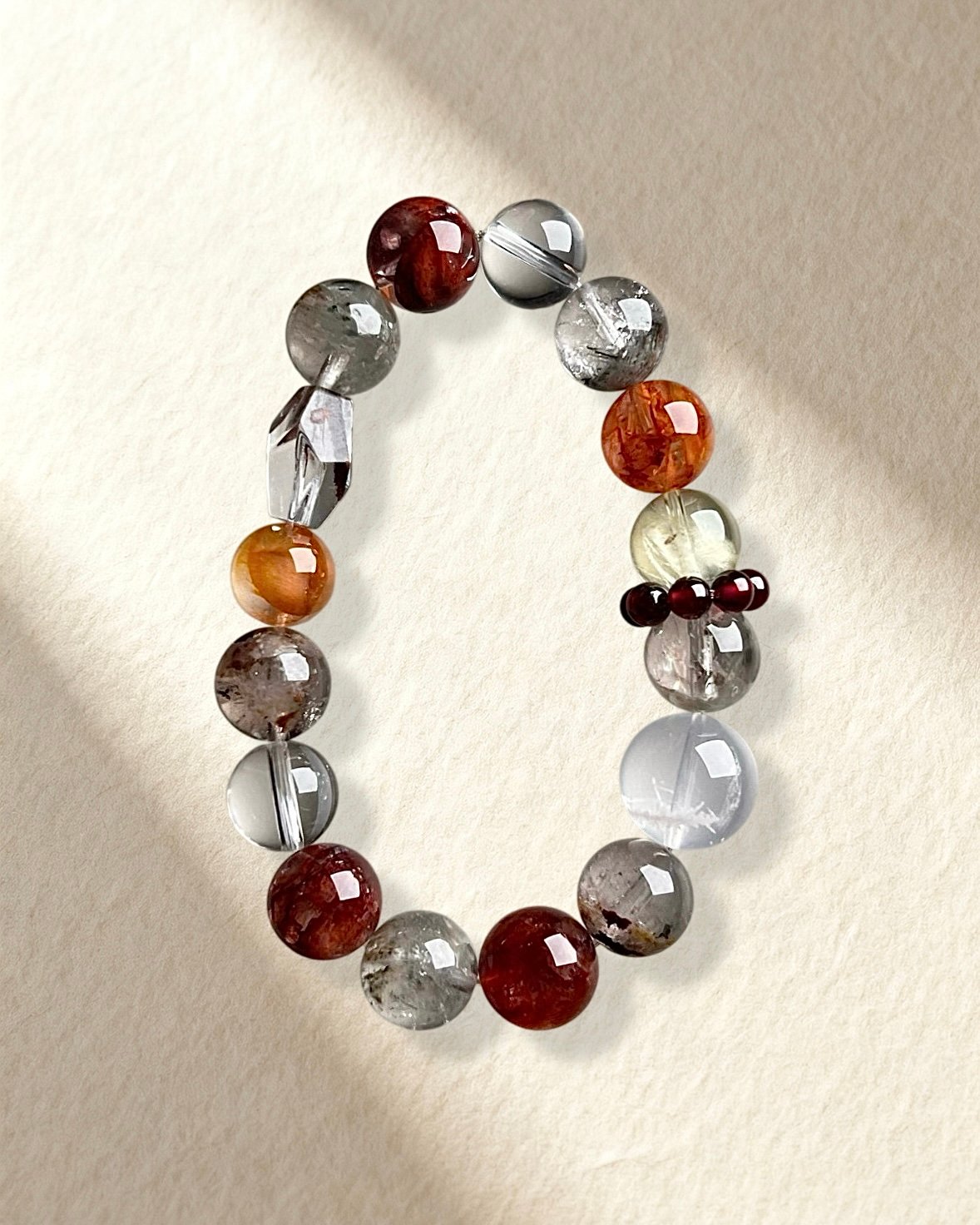 Black Rutilated Quartz, Red Hematoid Quartz, Yellow Azeztulite, Phantom Quartz, Clear Quartz, with Garnet accent bead.