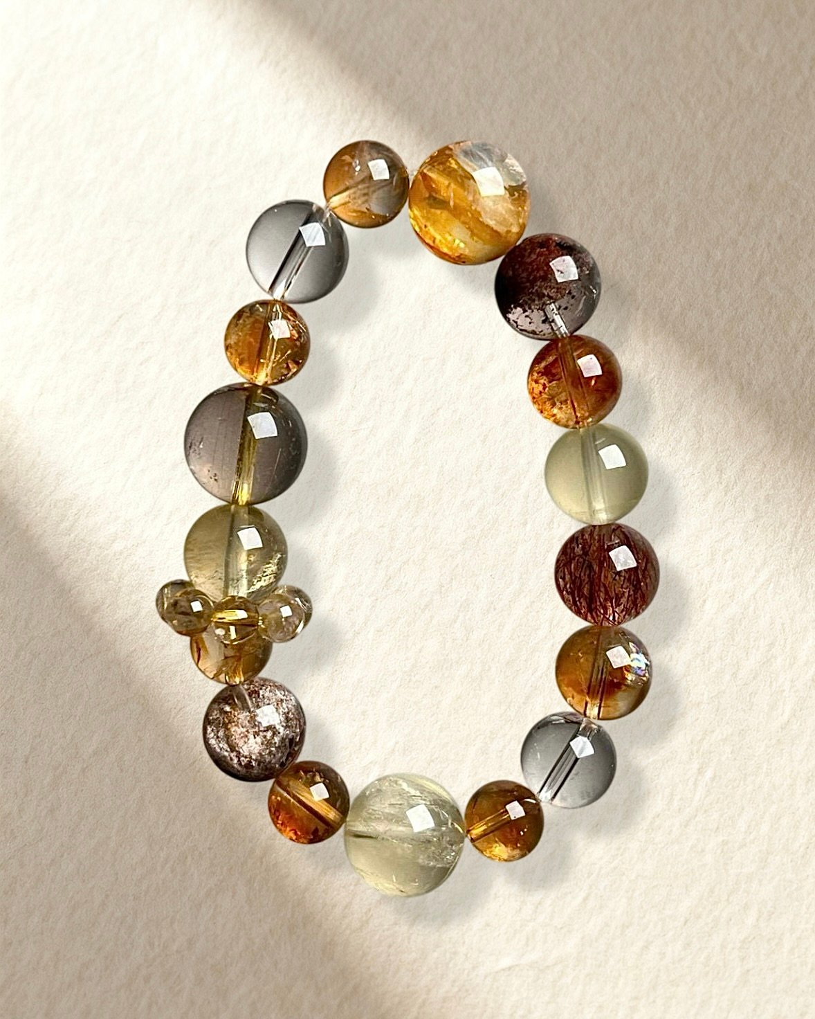 Citrine, Clear Quartz, Golden Rutilated Quartz, Red Phantom Quartz, Golden Topaz, Black Gold Super Seven, and Yellow Hematoid Quartz.