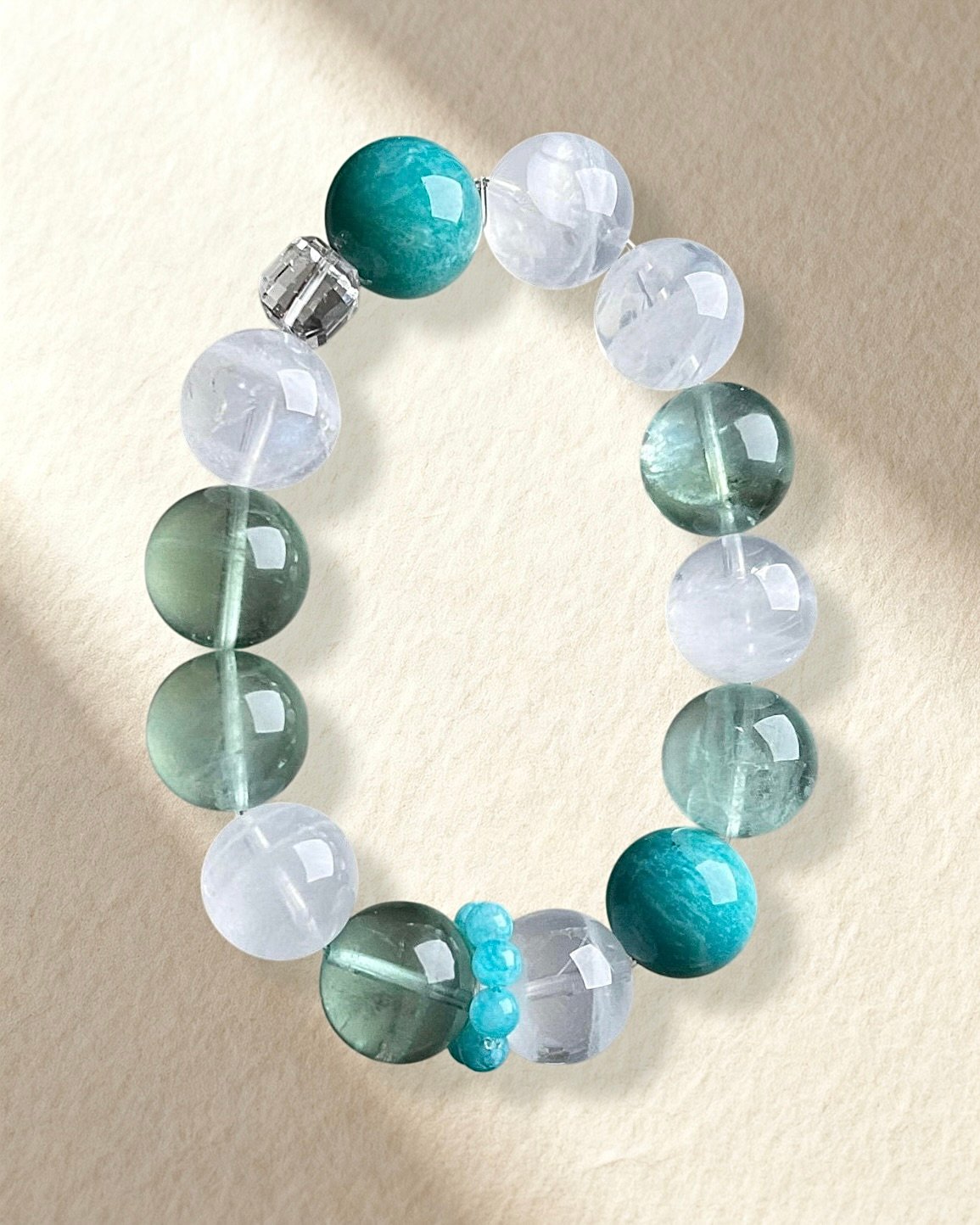 Natural White Phantom Quartz, Green Fluorite, Amazonite, and Clear Quartz.