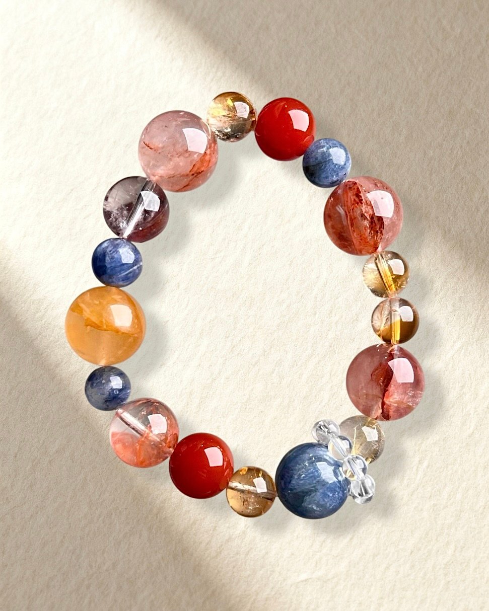 Red Hematoid Quartz, Golden Topaz, Kyanite, Red Agate, Yellow Hematoid Quartz, with Clear Quartz Ring Bead.