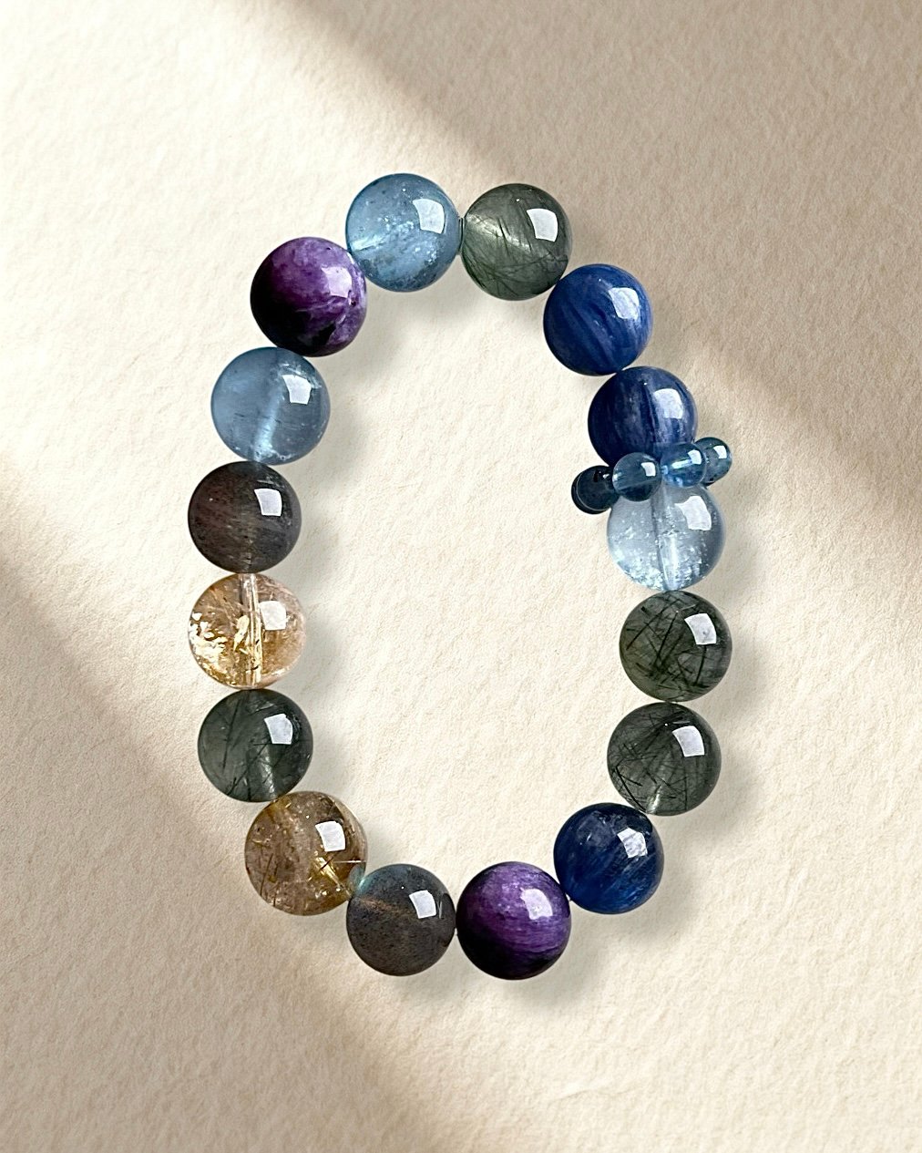 Natural Kyanite, Green Rutilated Quartz, Aquamarine, Charoite, Grey Moonstone, Yellow Azeztulite, and Golden Rutilated Quartz.