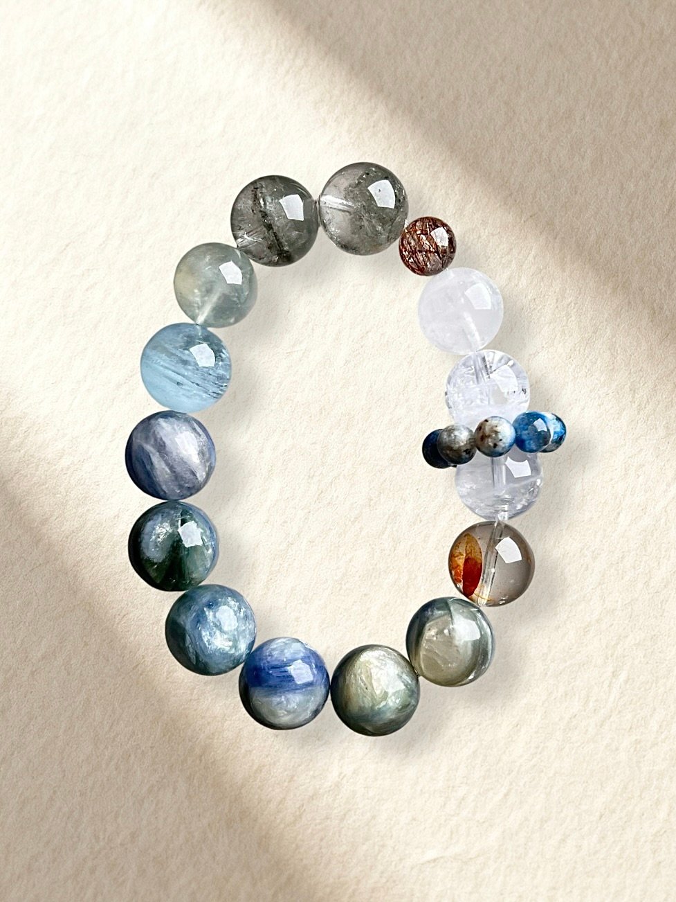 Orange Hematoid Quartz, White Phantom Quartz, Black Gold Super Seven, Green Phantom Quartz, Prehnite, Aquamarine, Kyanite.