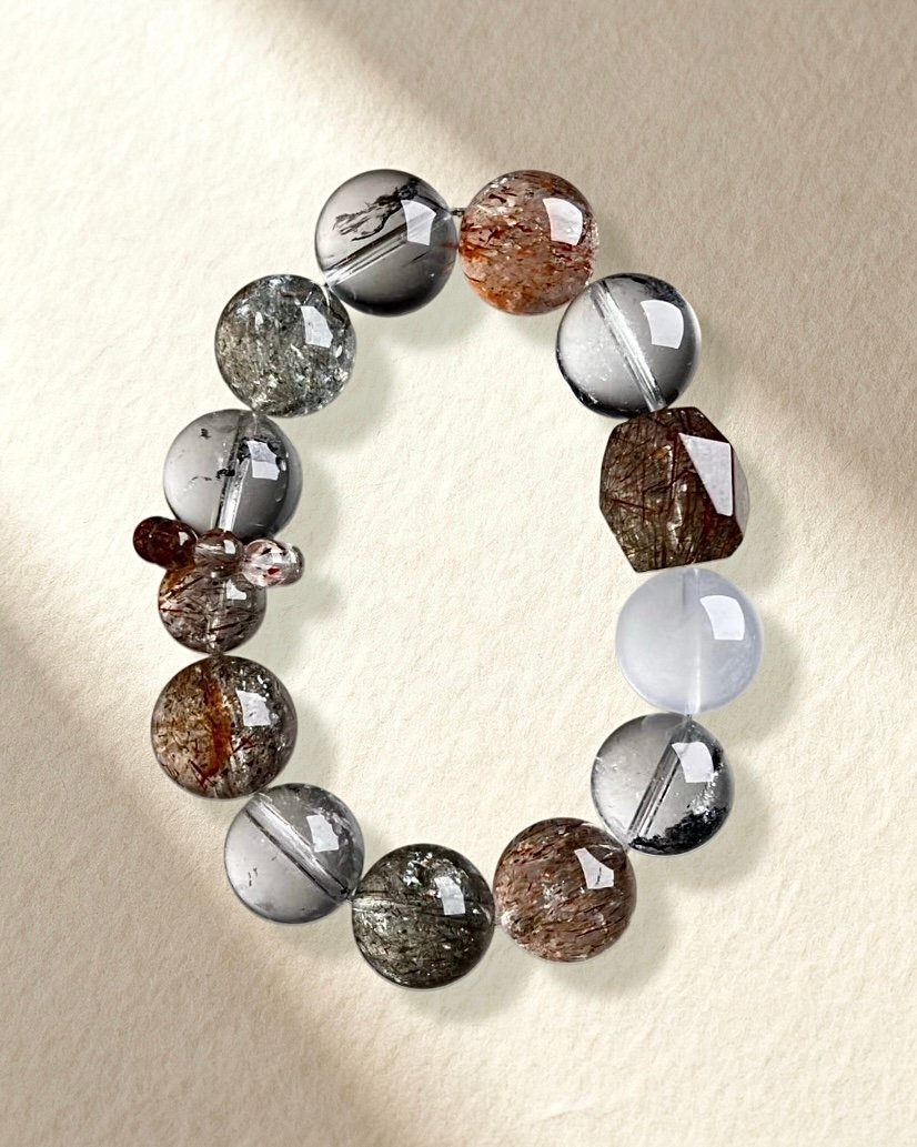 Natural Black Golden Super Seven, Black Herkimer Diamond, and White Phantom Quartz.