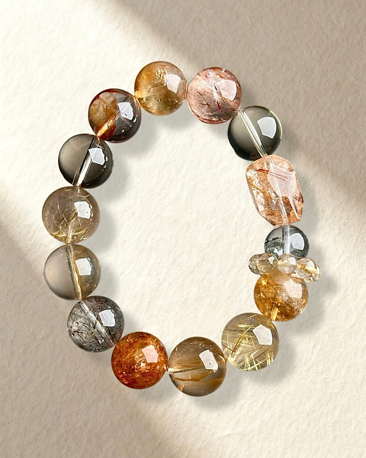 Natural Hematoid Quartz, Citrine, Golden Rutilated Quartz, Copper Rutilated Quartz, Black Gold Super Seven, and Green Phantom Quartz.