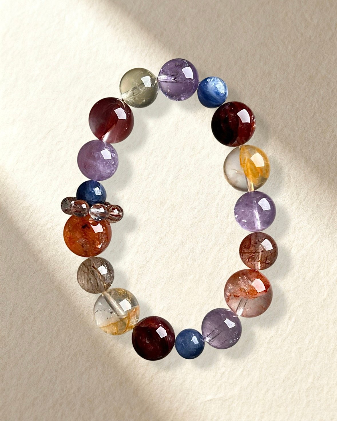 Natural Red Hematoid Quartz, Citrine, Purple Azeztulite, Kyanite, Yellow Hematoid Quartz, Orange Hematoid Quartz, and Black Golden Super Seven.