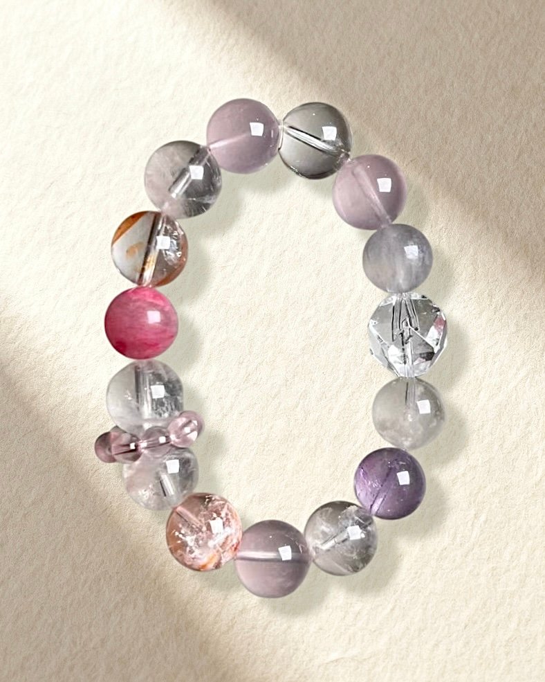 Rose Quartz, Orange Snow Phantom Quartz, White Azeztulite, Yellow Hematoid Quartz, and Clear Quartz.