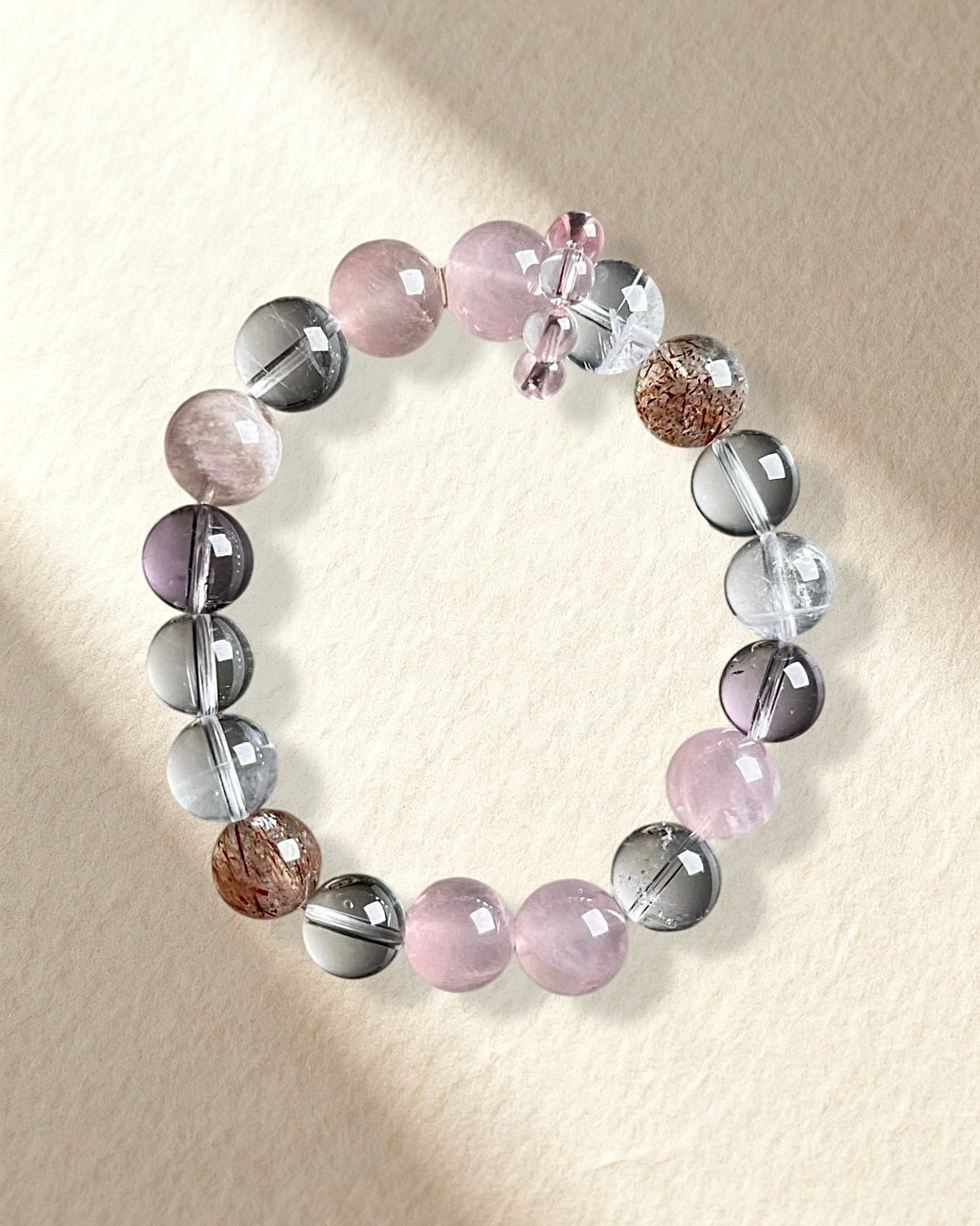 Natural Rose Quartz , White Phantom Quartz, Black Gold Super Seven, Amethyst, Clear Quartz, with Rose Topaz accent bead.
