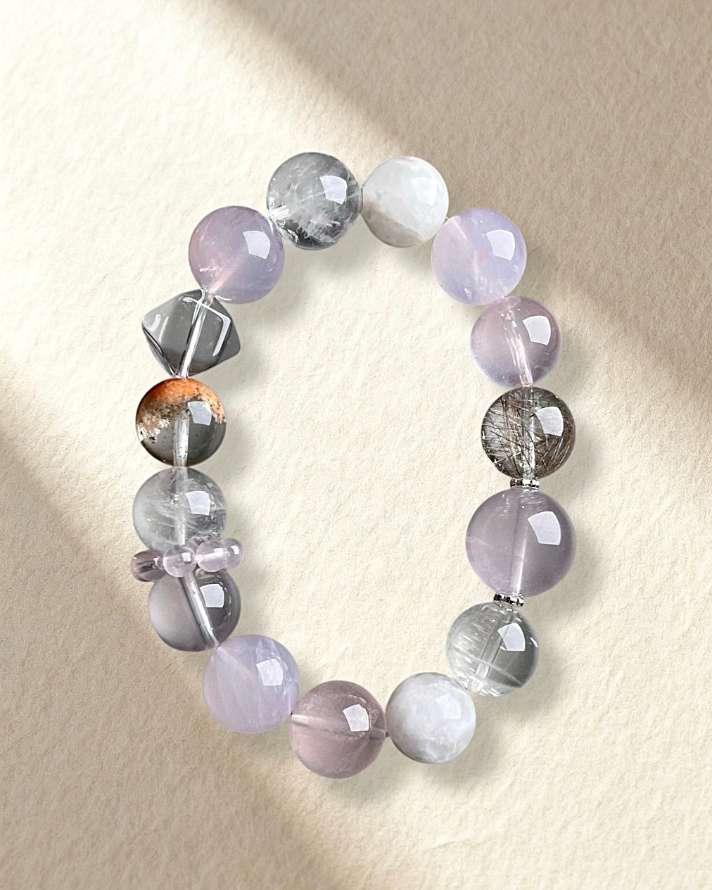 Natural Rose Quartz, Silver Rutilated Quartz, White Snowflake Phantom Quartz, Clear Quartz, and Colorful Phantom Quartz.