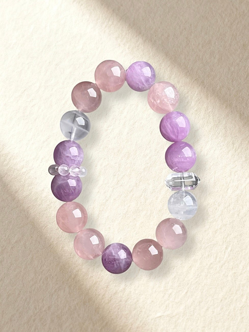 Rose Quartz, Kunzite, White Phantom Quartz, Clear Quartz.