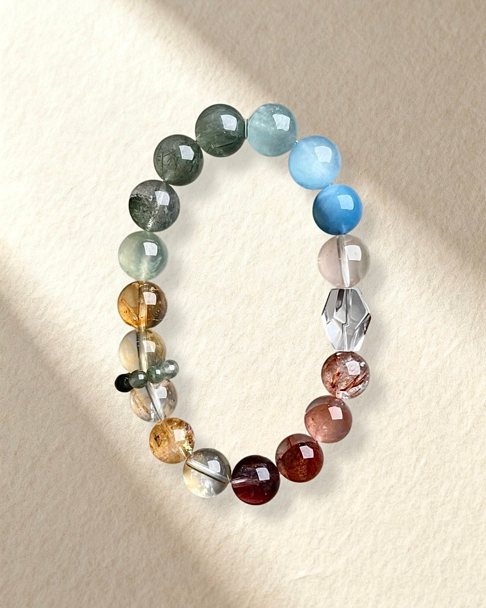 Red Phantom Quartz, Yellow Hematoid Quartz, Aquamarine, Green Rutilated Quartz, Green Phantom Quartz, Prehnite, Citrine, Red Hematoid Quartz, Black Gold Super Seven, Green Rutilated Quartz.