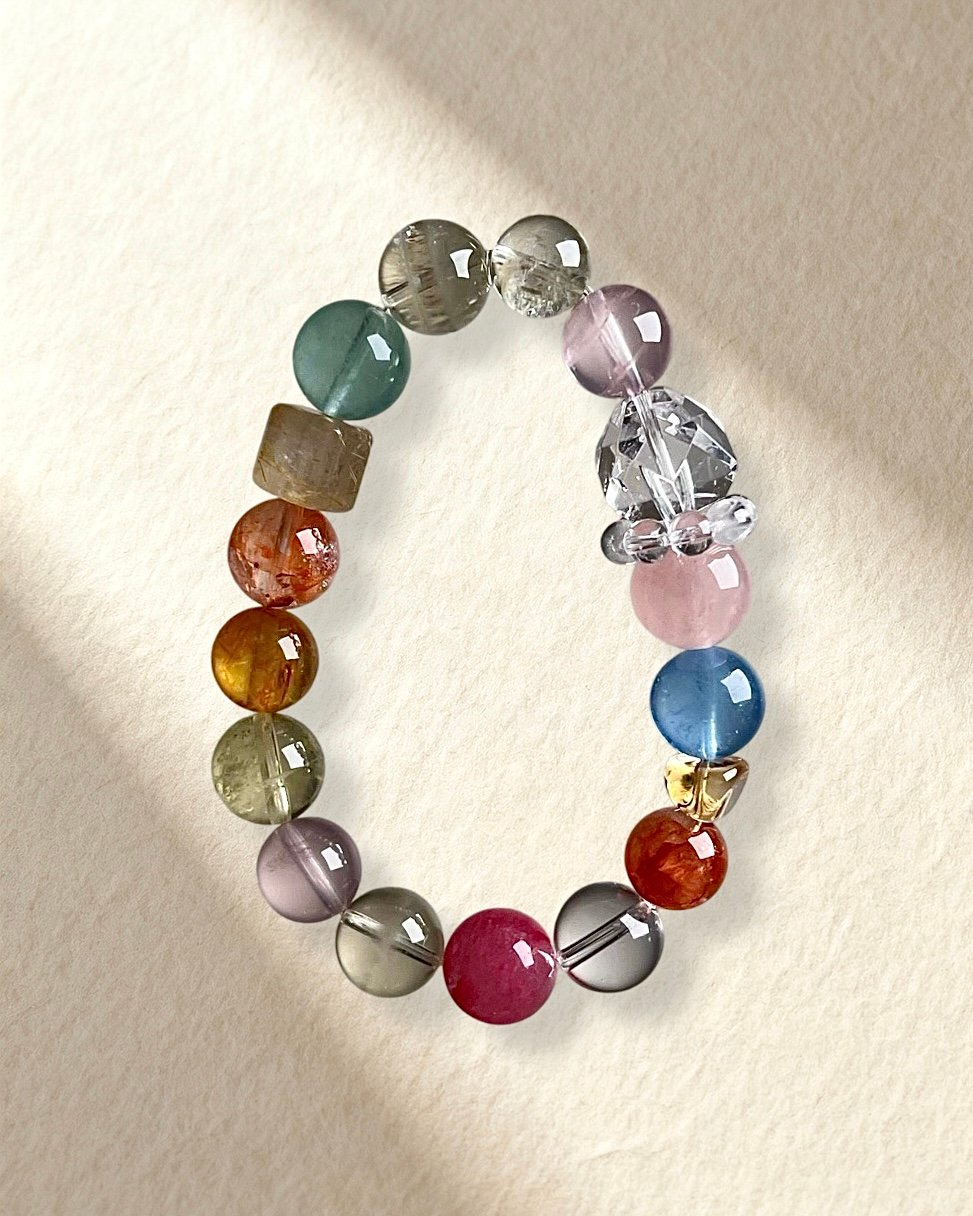 Yellow Phantom Quartz, Green Fluorite, Golden Rutilated Quartz, Red Hematoid Quartz, Yellow Hematoid Quartz, Citrine, Rose Quartz, Rhodonite, Clear Quartz, Aquamarine.
