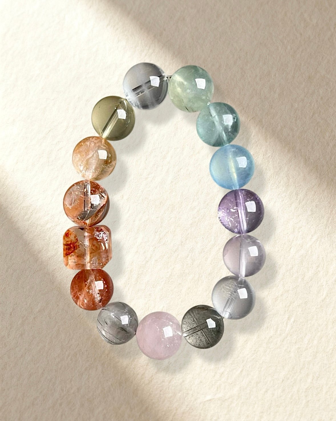 Natural Red Hematoid Quartz, Black Rutilated Quartz, Rose Quartz, Green Phantom Quartz, Amethyst, Aquamarine, Green Fluorite, Prehnite, White Phantom Quartz, and Citrine.