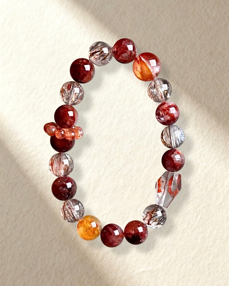 Orange & Red Phantom Quartz, Black Gold Super Seven, Red Hematoid Quartz, Yellow Hematoid Quartz, with Golden Strawberry Quartz Ring Bead.