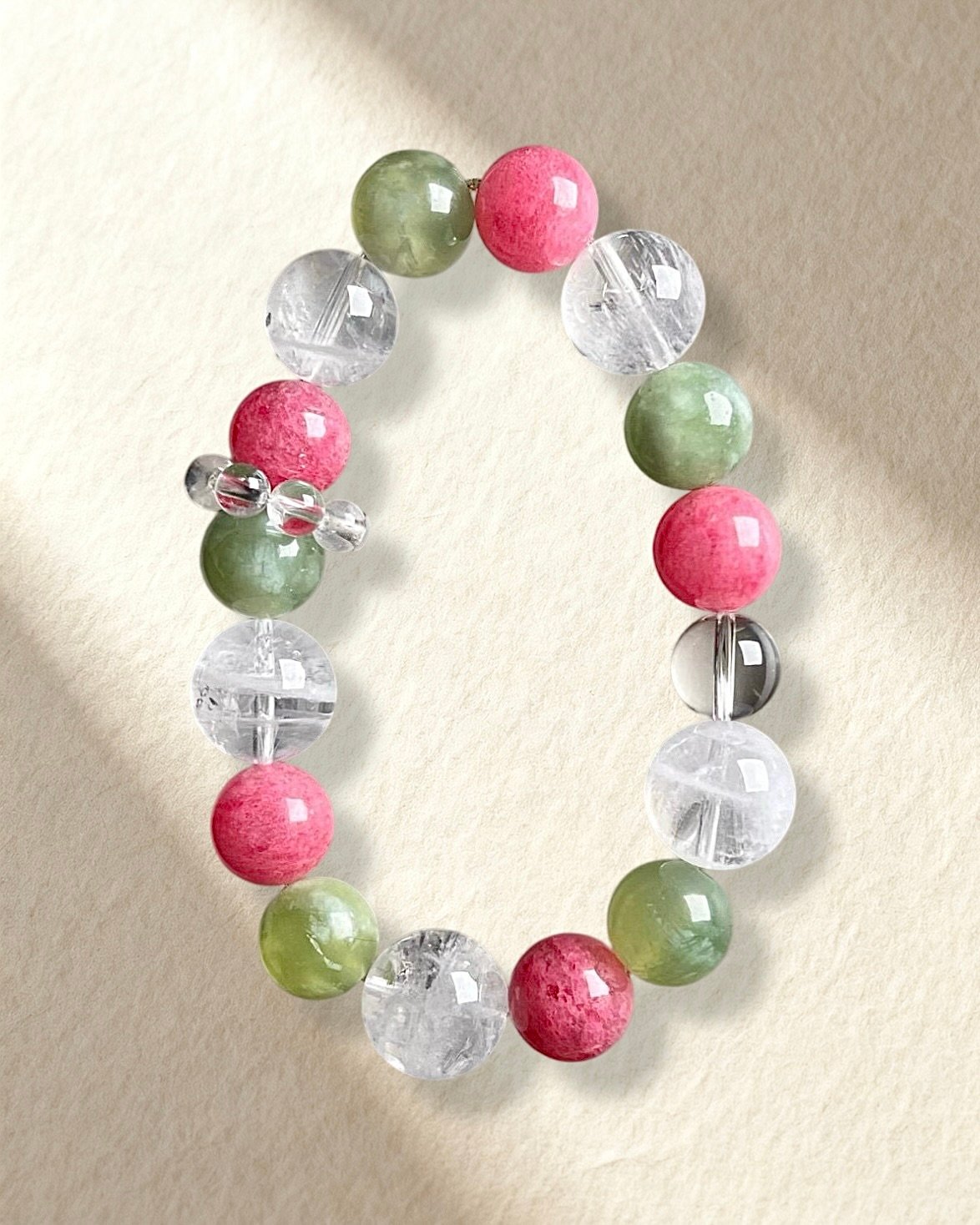 White Phantom Quartz, Rhodonite, Clear Quartz, Serpentine Jade.