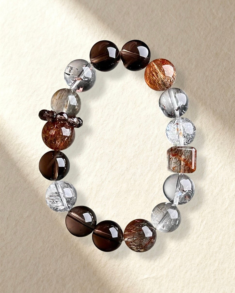 Black Gold Super Seven, Smoky Quartz, White Azeztulite, Black Gold Super Seven Cube, and Smoky Quartz Ring Bead.