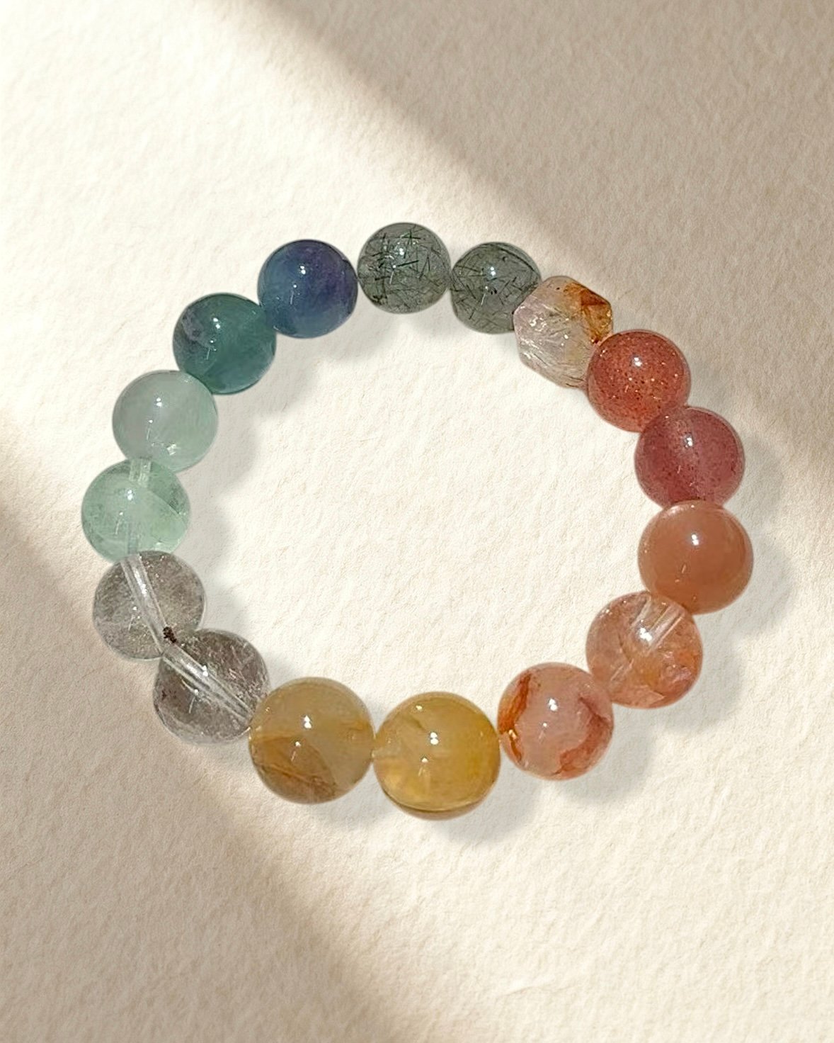 Strawberry Quartz, Sunstone, Red Hematoid Quartz, Yellow Hematoid Quartz, Green Rutilated Quartz, Fluorite.